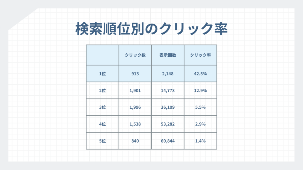 実際、SEO会社ランクエストの調査(2025年3月)によると、検索結果1位のクリック率は約42.5%、2位は約12.9%、3位以降はさらに低下します。